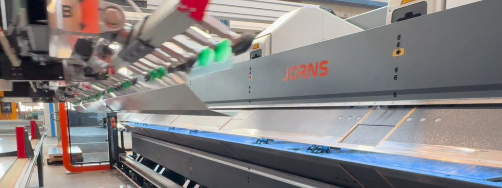 Jorns Doppelbiegemaschine JDB-150G-HM-DP-SE-1250-JC100-6.4-dsp, ausgestattet mit dem automatisierten Seiteneinzugssystem-1250 sowie mit der Maschinensteuerung JC100, die eine direkte Schnittstelle zur "Bendex Enterprise Suite" von MicroSea bietet.